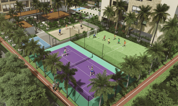 Cancha de tenis, voley playa y sintética; gimnasio, spinning y TRX; pista de trote y semicancha de basket.